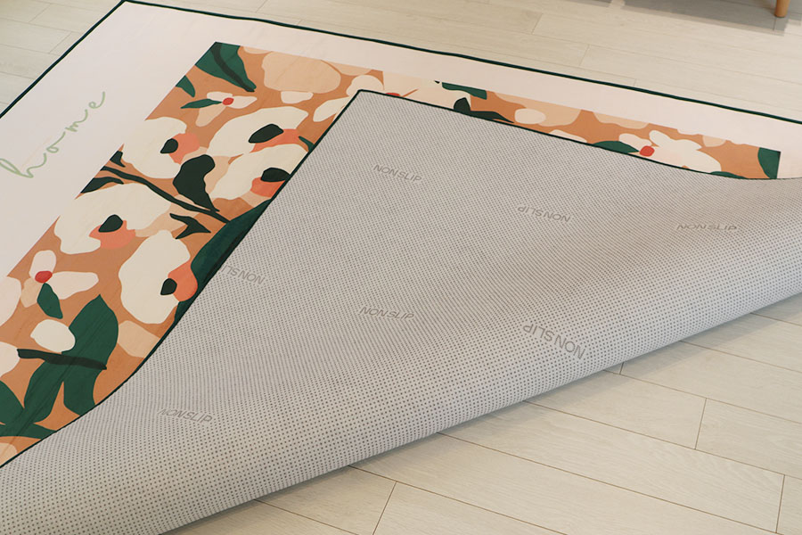바닥면은 미끄럼 방지 매트인 논슬립 원단을 사용해서 미끄러짐을 최소화 했습니다. 집에서나 어디서든 깔끔하게 정갈하게 사용할 수 있는 카페트 러그 제품입니다.